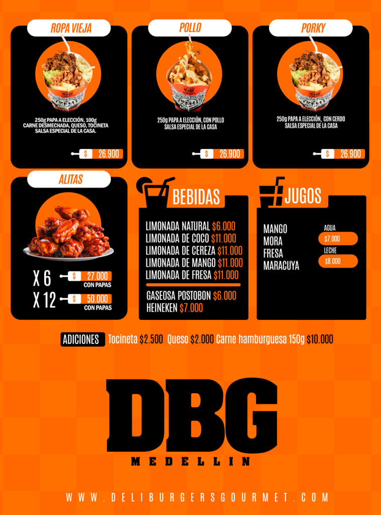 Pan, lechuga, tomate, carne de res 200g, queso mozarella, tocineta, cerdo desmechado en salsa BBQ, cebolla caramelizada, salsa casera, papas a elecciòn.